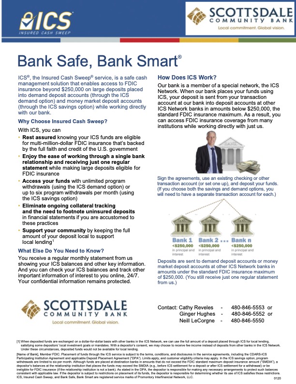 Scottsdale Community Bank offers Insured Cash Sweep as a member of a unique network – the ICS Network. Everything is handled through our bank. When you place a large deposit with Scottsdale Community Bank as an ICS Network member, our bank uses the ICS service to place your funds into demand deposit accounts (using the ICS demand option), money market deposit accounts (using the ICS savings option), or both, at other FDIC-insured member institutions.